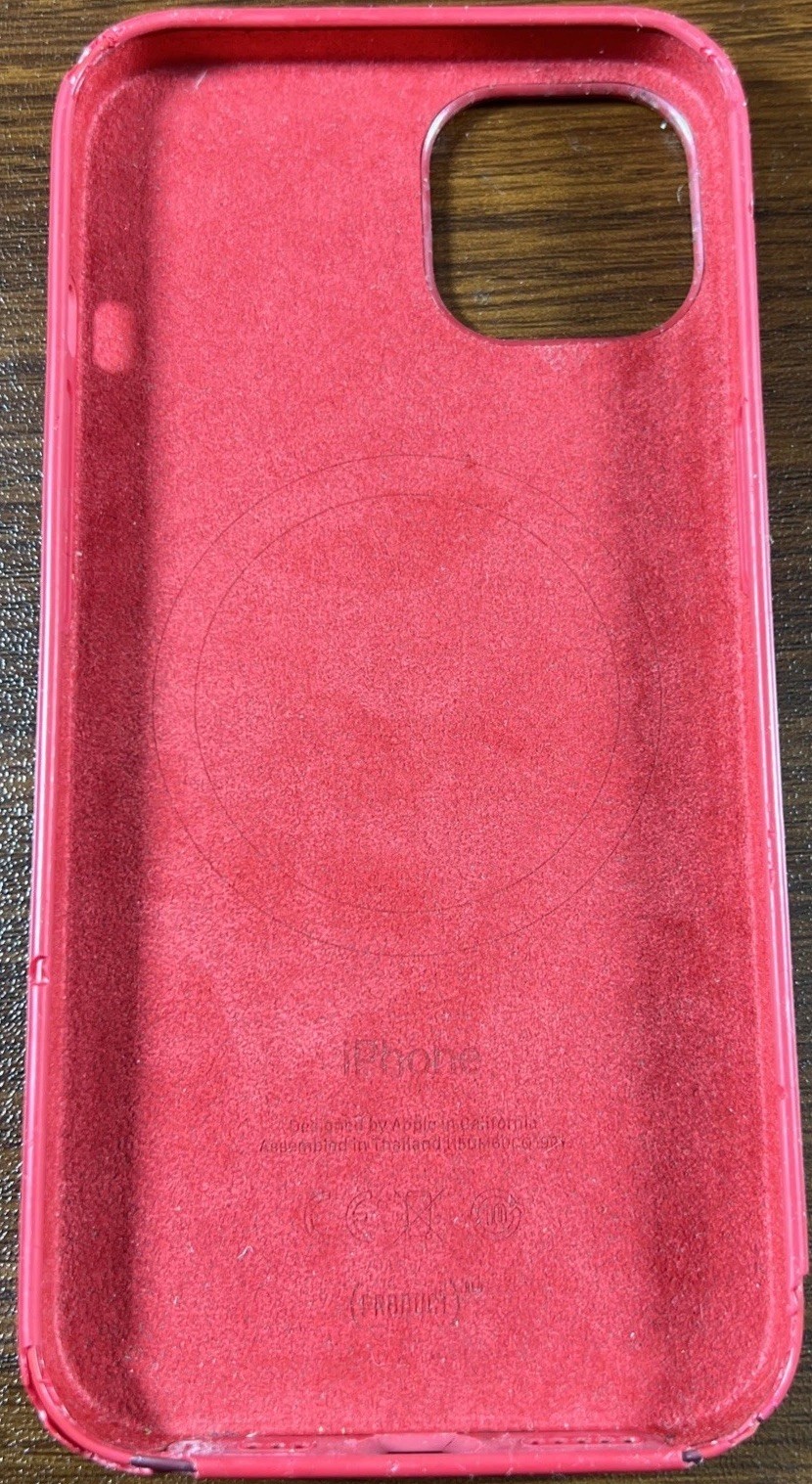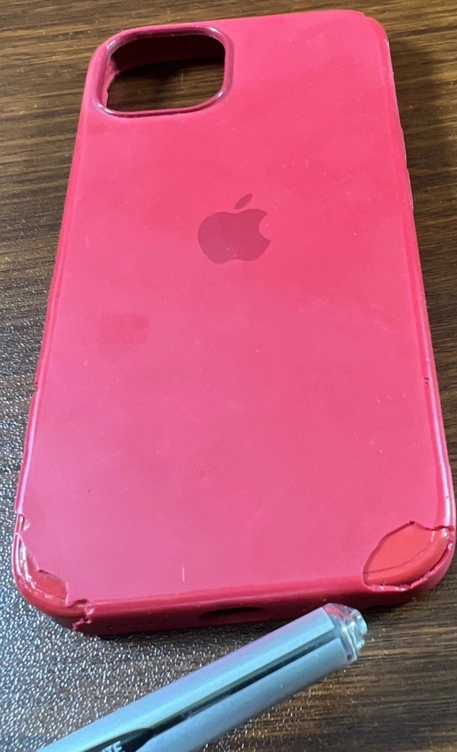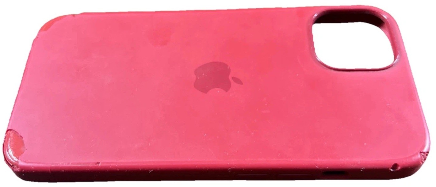 The Original Silicone Phone Case with MagSafe for iPhone 13 in (PRODUCT)RED is a slim and lightweight back case made of liquid silicone. It is designed to provide protection against dust and shock, while also featuring accessible controls and a non-slip finish. This case is compatible with the Apple iPhone 13 model and is wireless charging compatible with Qi standard. Made by Apple, this red case is perfect for those looking for a stylish and functional way to protect their device. This case has a small crack on the bottom right side and has some damage around every corner. Please see pictures for a better representation. This case still holds up well.