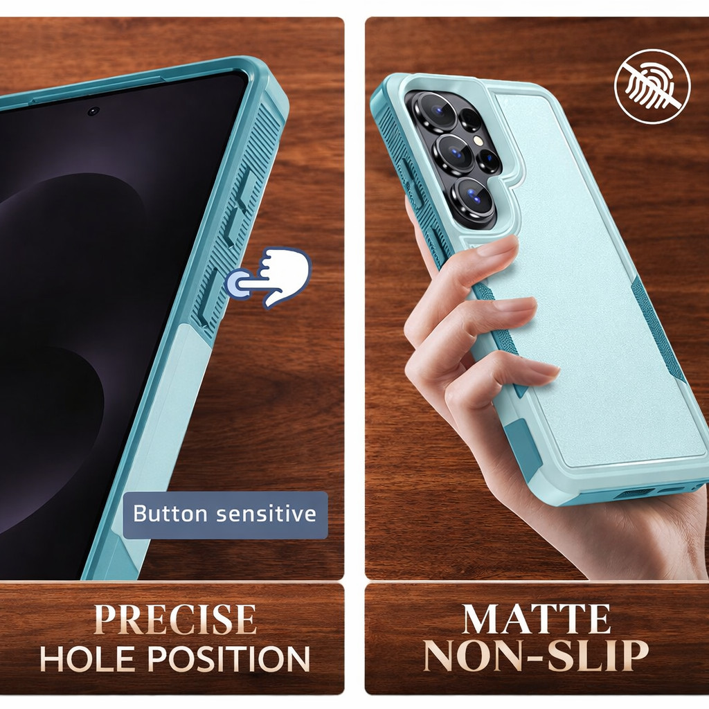 SAMSUNG GALAXY S26 SERIES. SAMSUNG GALAXY S26. SAMSUNG GALAXY S26 PLUS. SAMSUNG GALAXY S26 ULTRA. MATERIAL : Dual layers of shockproof TPU and solid PC for double protection. ARMOR BUILT : Tough built for heavy protection, survive 6 feet drop test, flexible TPU with outer case that amazing against drop and impacts.