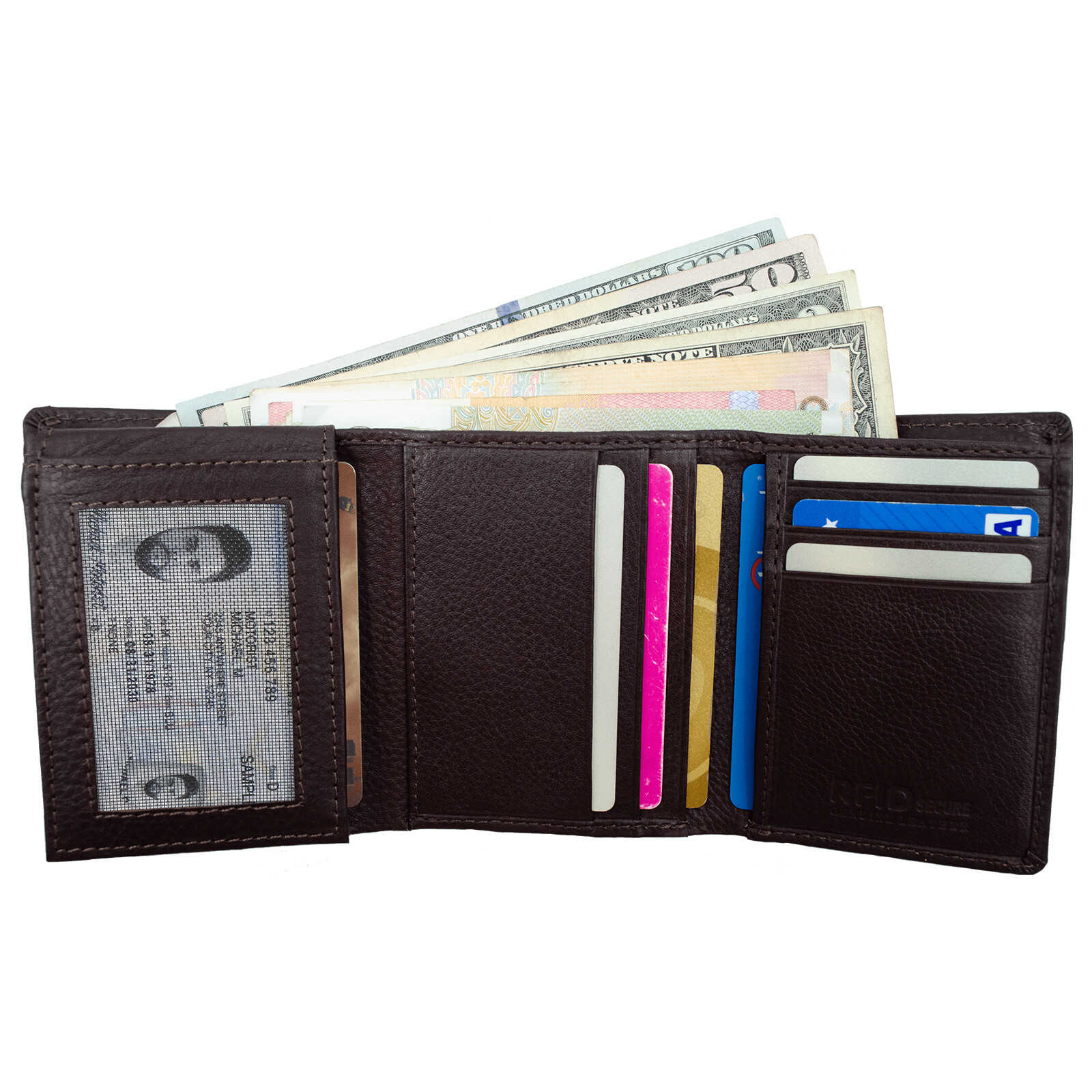 GENUINE LEATHER :This Trifold Wallet is Made from Premium Cowhide Leather which is light in weight. The thread used for stitching is strong and also enhances the overall look of the wallet. RFID Blocking.