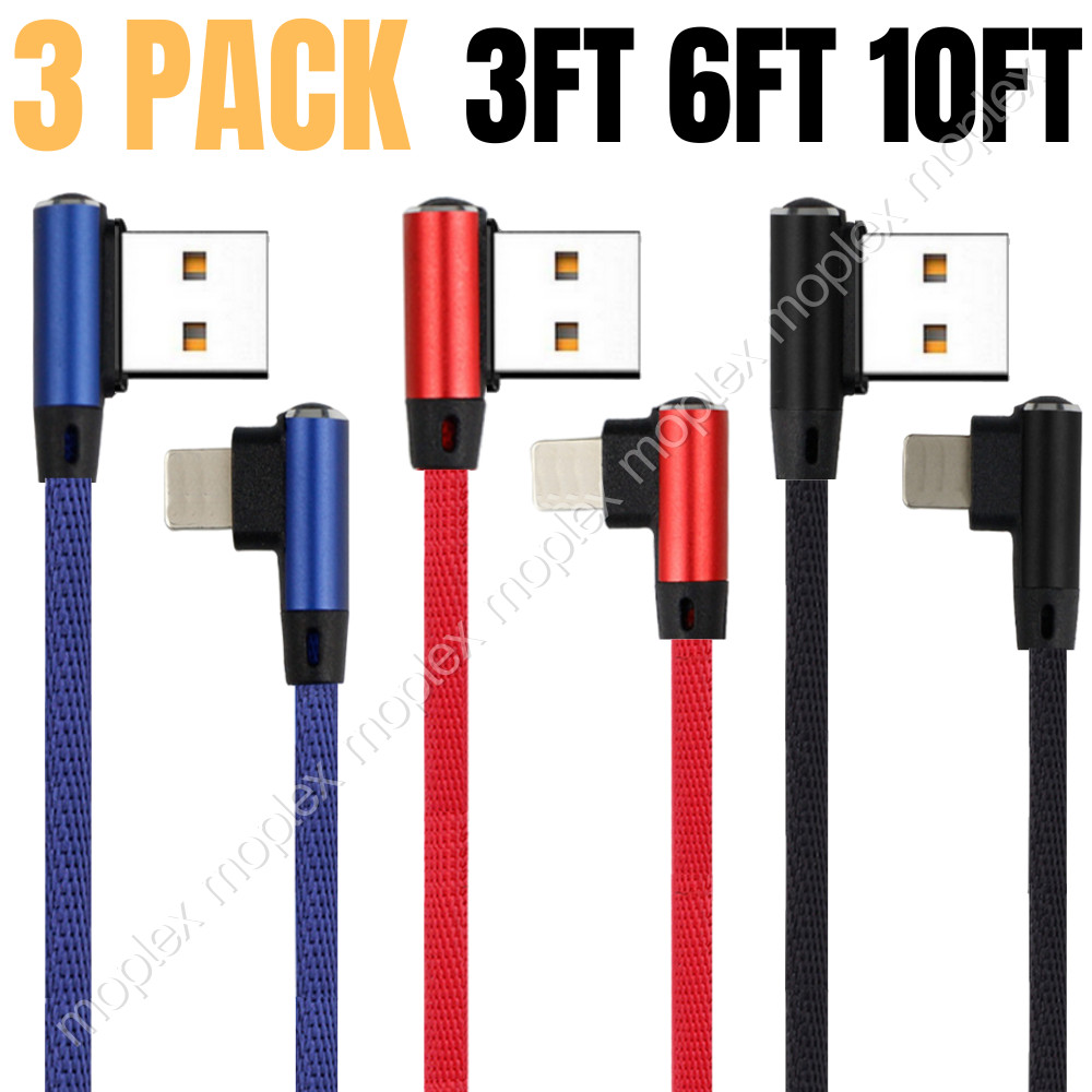 3Pack 3/6/10Ft 90 Degree Right Angle USB Cable For iPhone 14 12 Charger Cord Lot