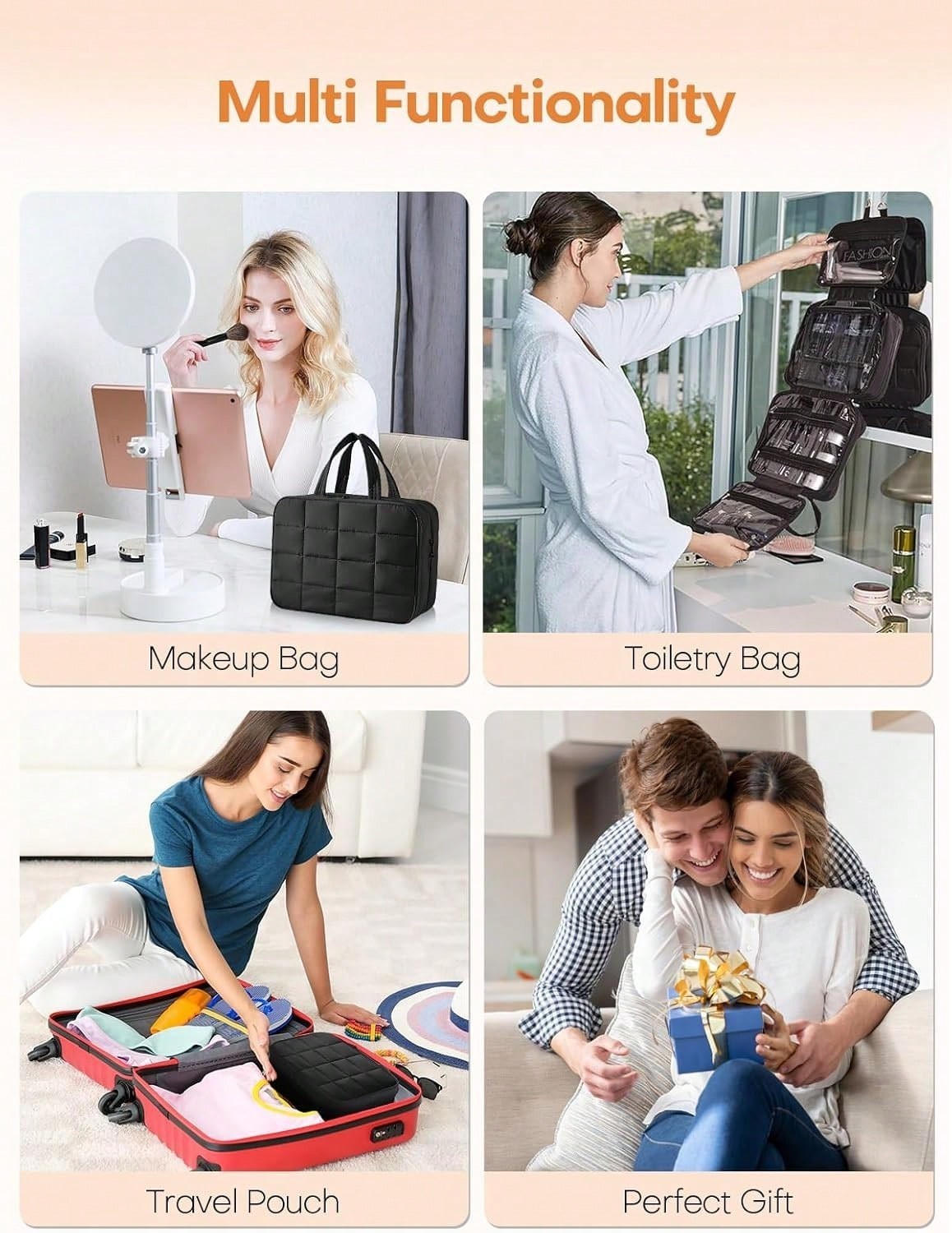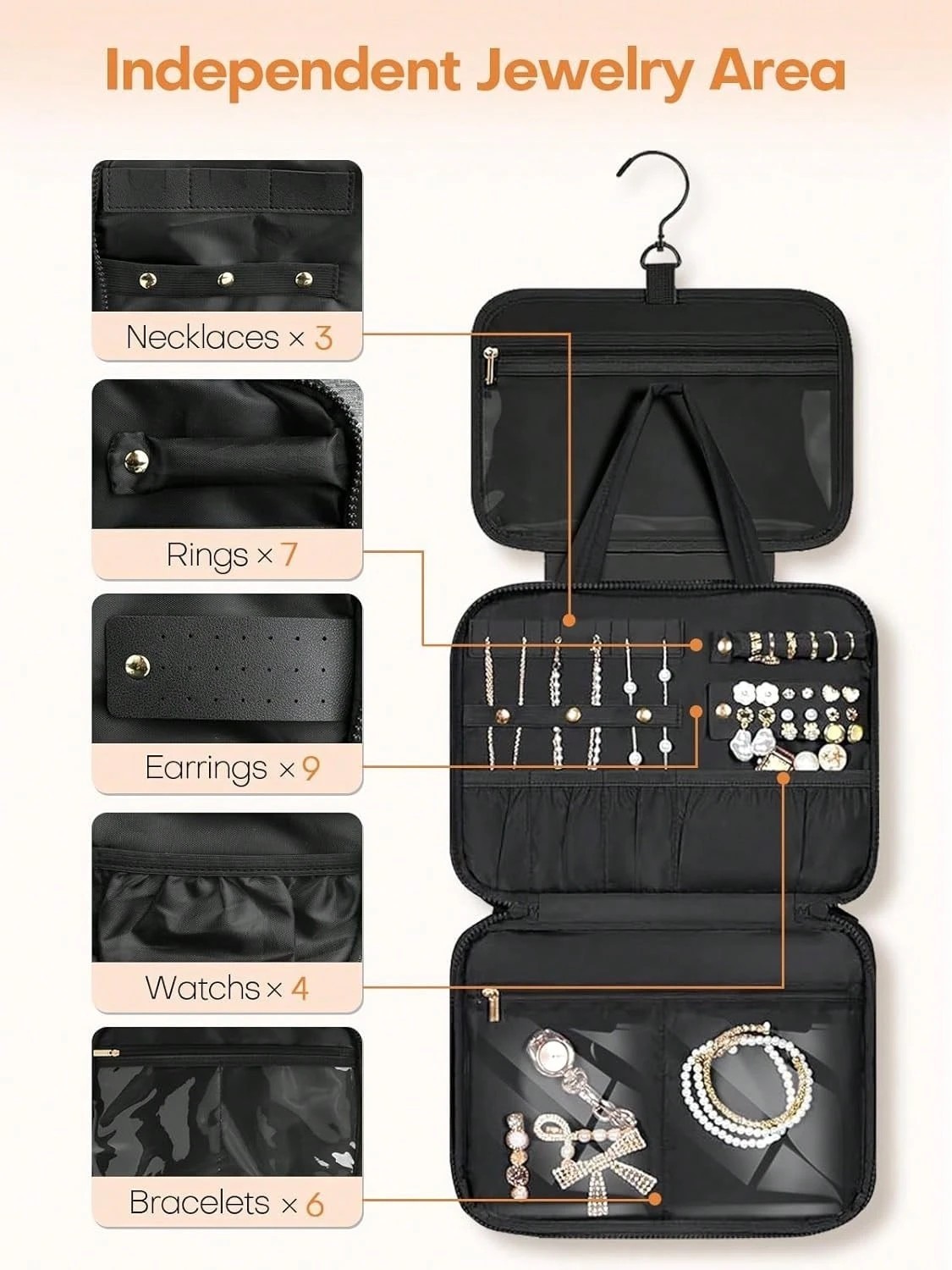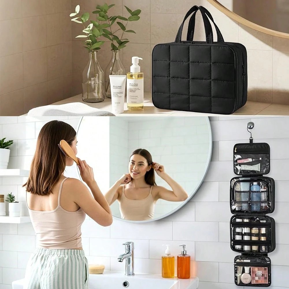 Travel in style and stay organized with thisStylish Hanging Travel Toiletry and Jewelry Organizer. With itspuffy design, the bag is lightweight and compact, yet spacious enough to hold all your essentials.