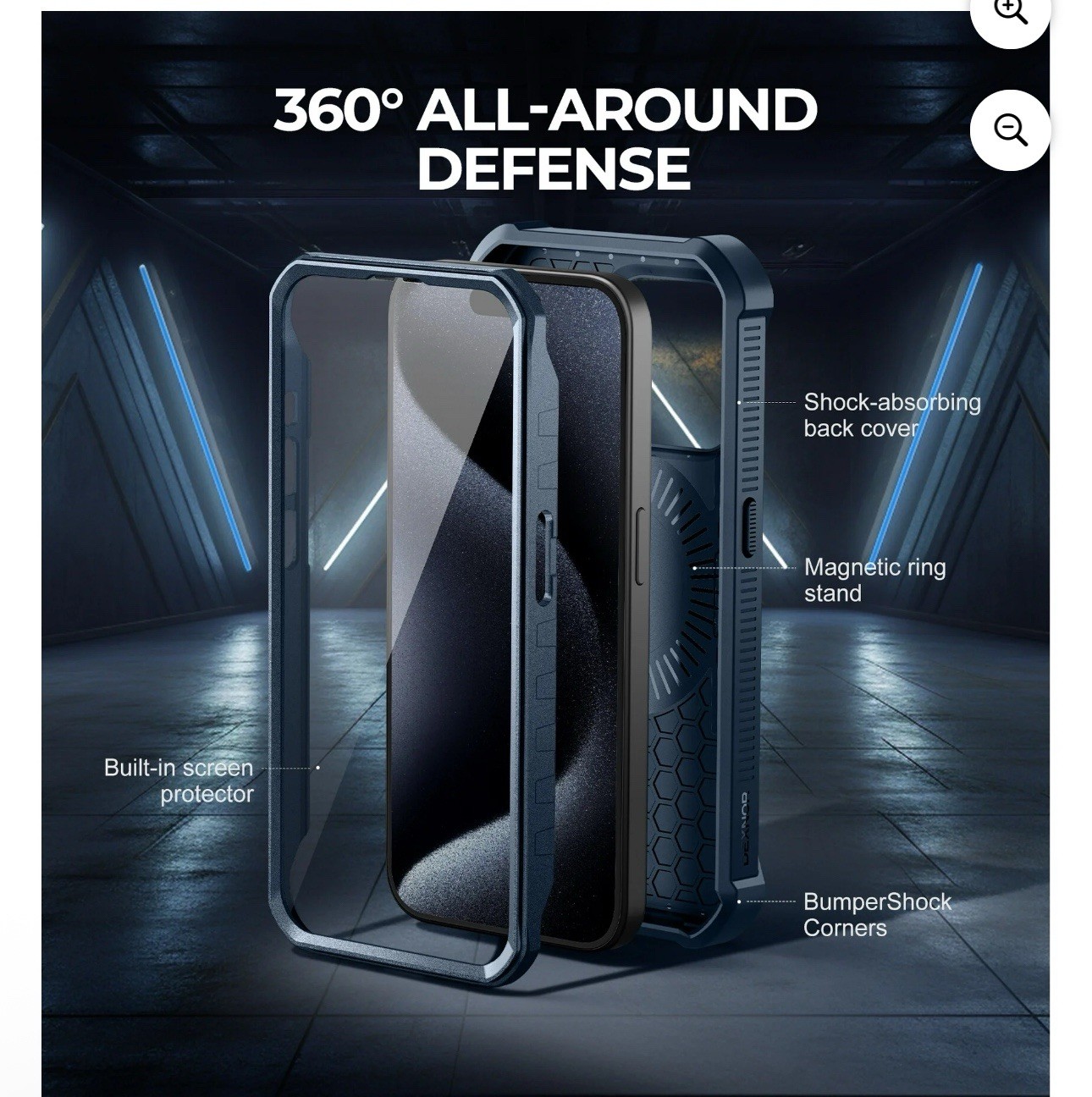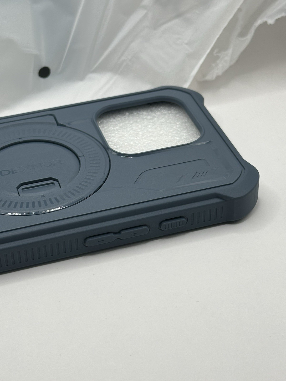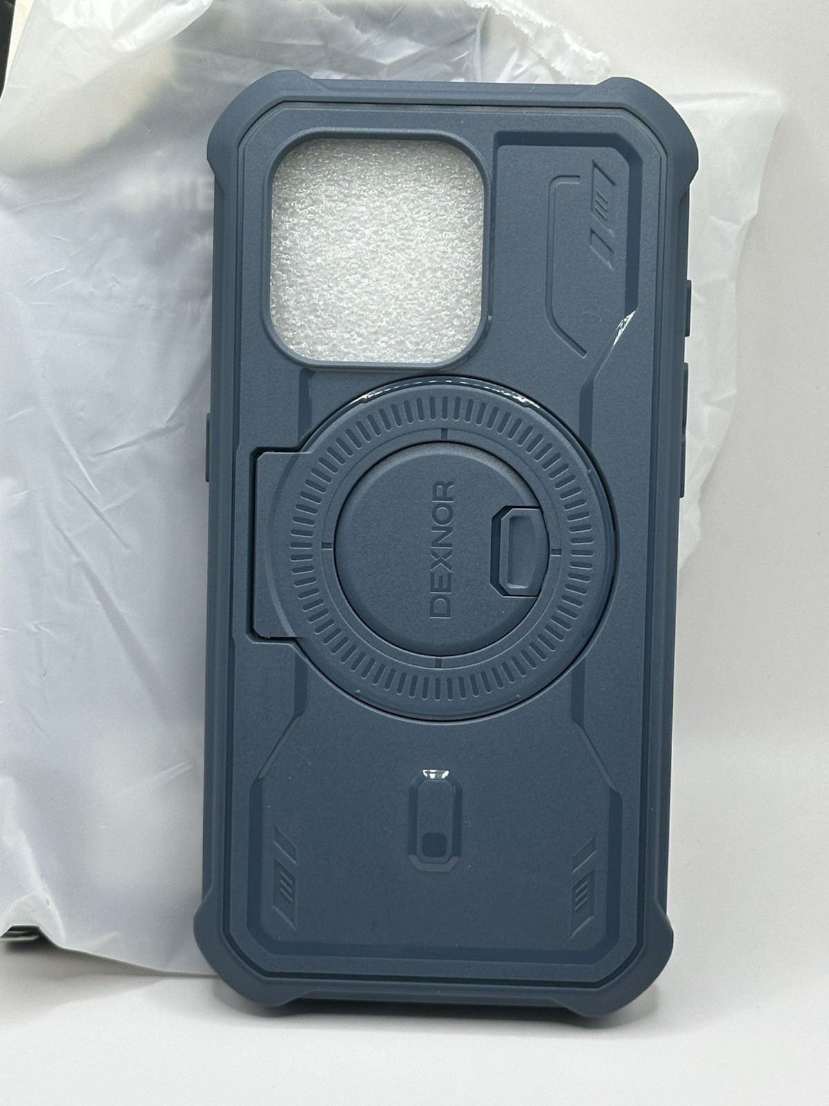 Open-box — no signs of heavy wear, works perfectly. This rugged Dexnor case has: • Built-in MagSafe magnet (1,400g hold) • Built-in screen protector for full front coverage  • Aluminum kickstand for hands-free viewing  • Shock-resistant bumper corners + PC/TPU construction for drop protection  • Rugged design + precise cutouts for the iPhone 15 Pro Condition: Open box, tested, no manual. Color: Navy